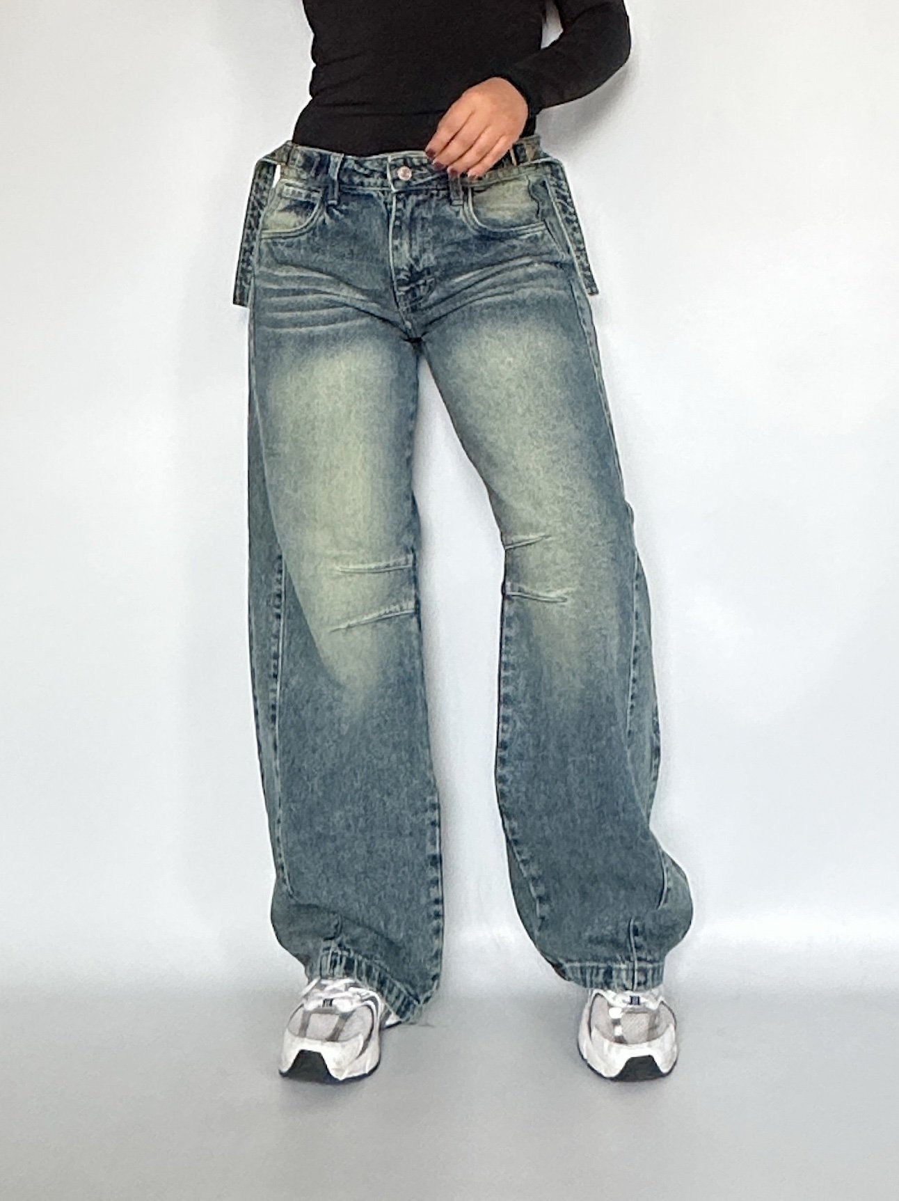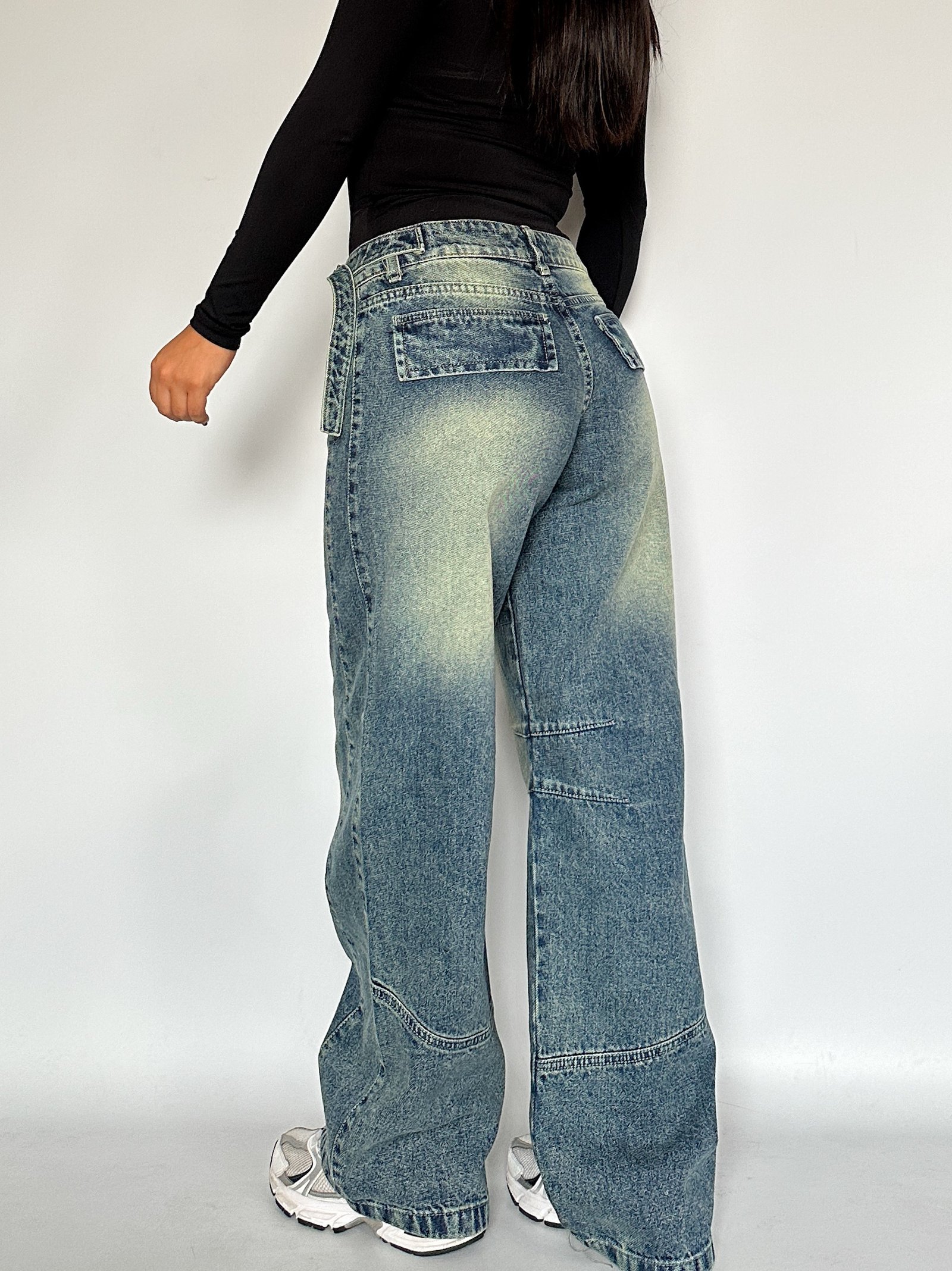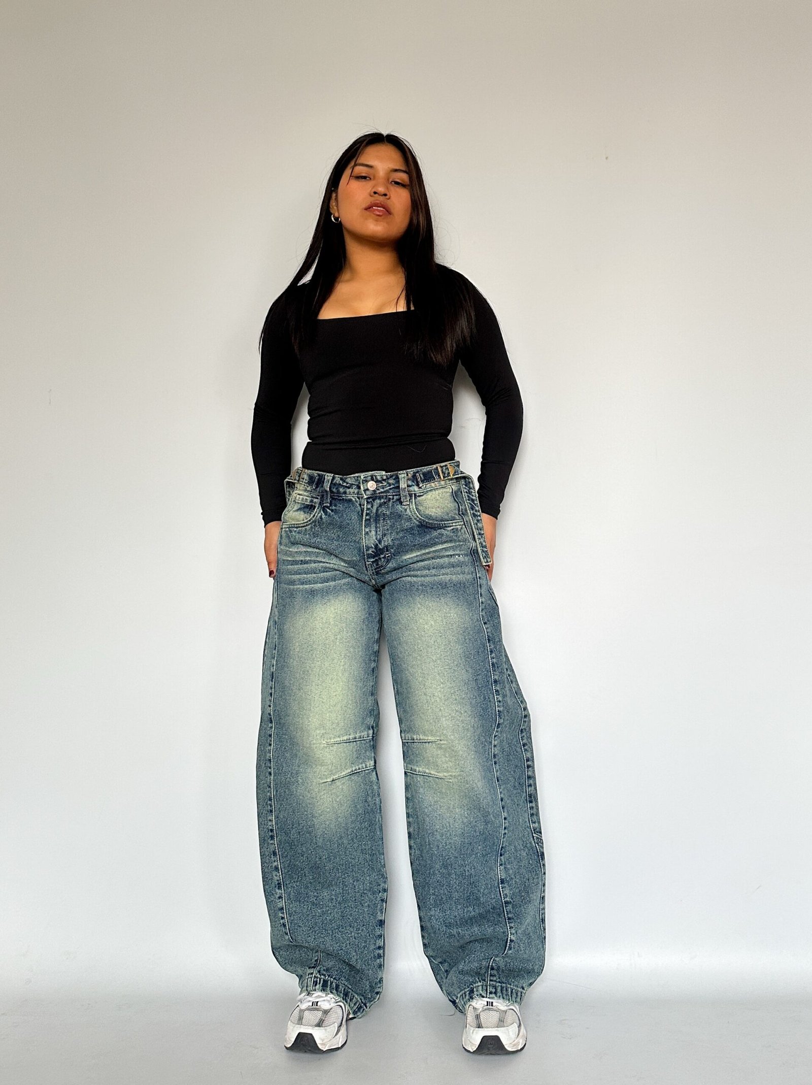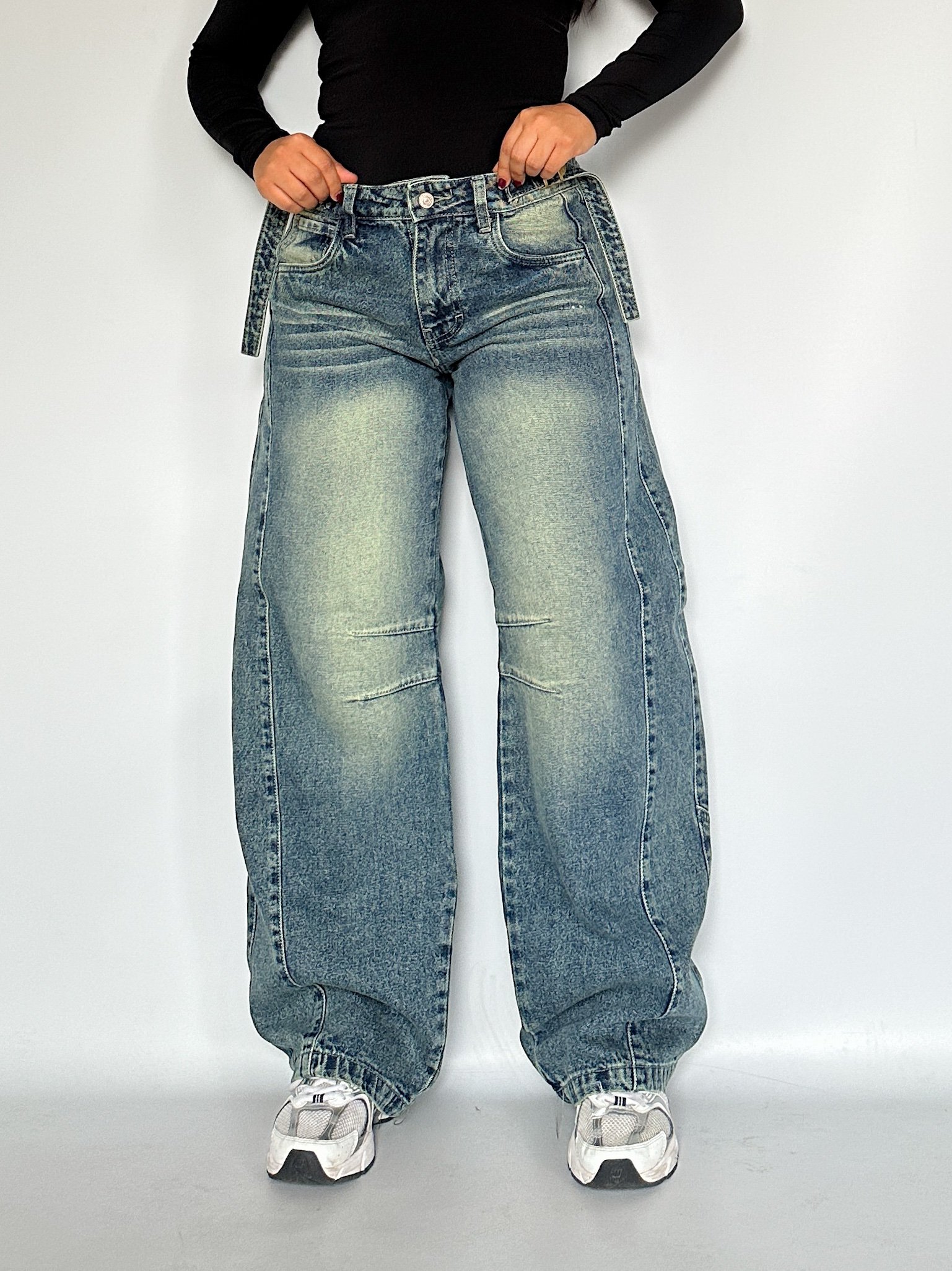 Jeans de fit barrel de tiro bajo. De piernas super anchas con detalle de pinzas.