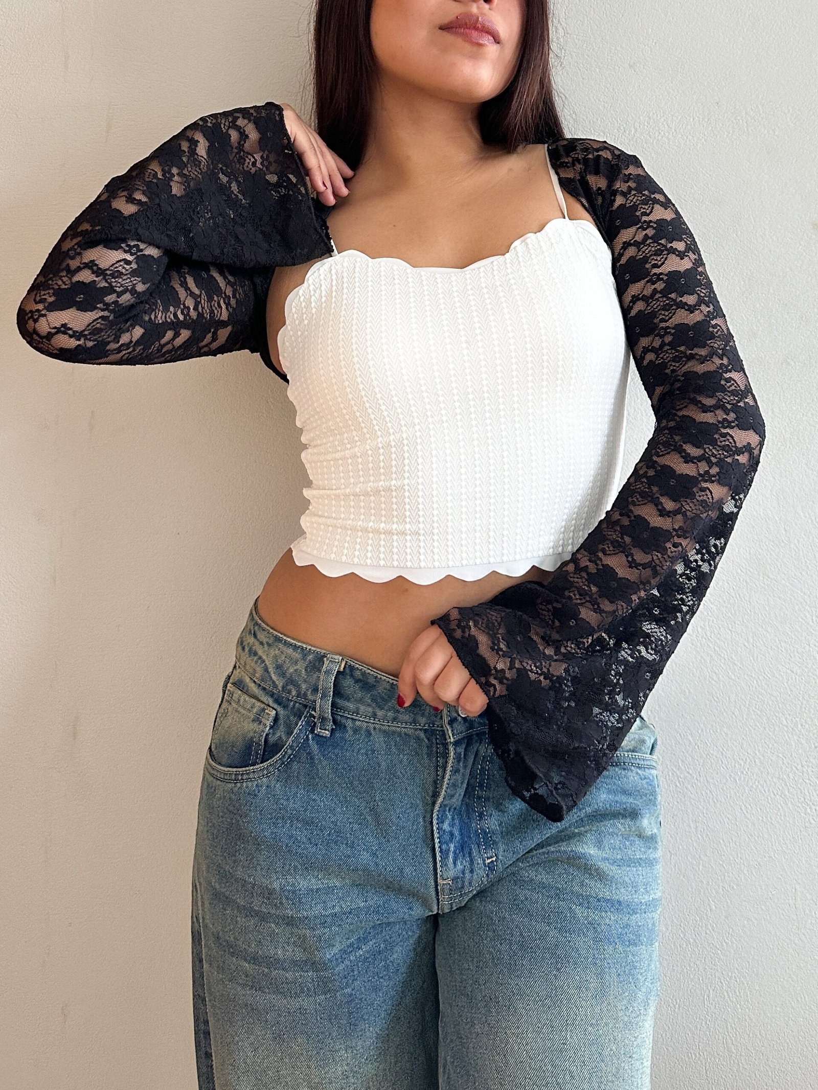 Manguitas crop de encaje con detalle de mangas acampanadas. Por su material y modelo es perfecto para todo tiempo y ocasión!