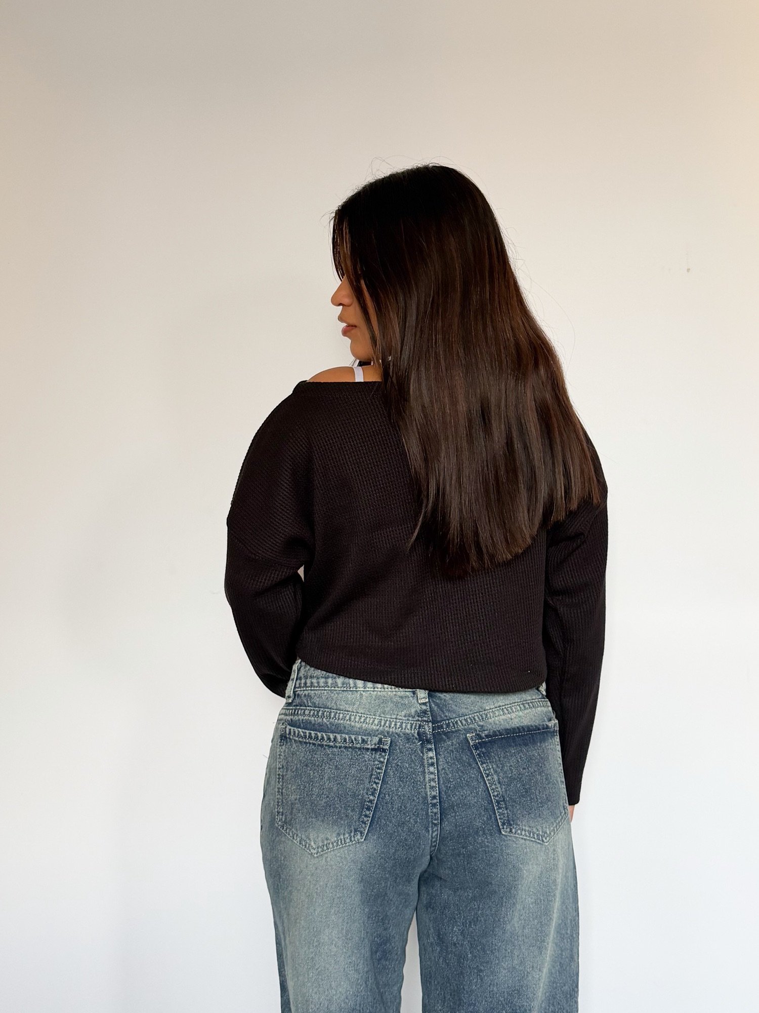 Chompa de cuello ojal, se puede usar de un hombro o ambos hombros descubiertos. En la calidad wafer que es muy suave al tacto.