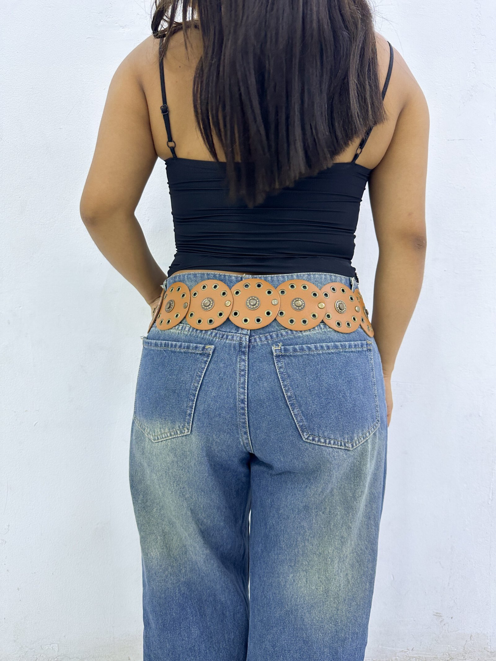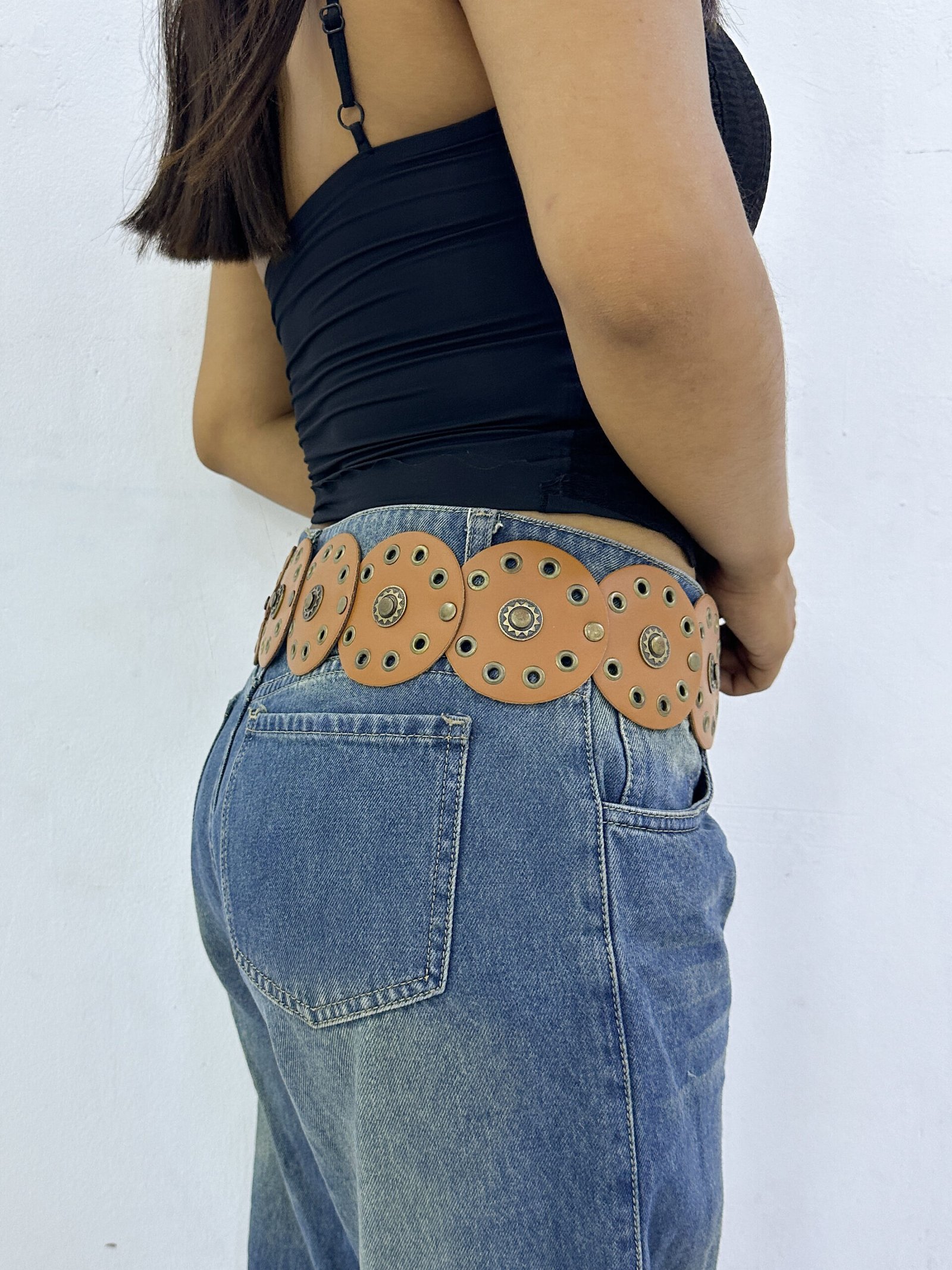 Hebilla metálica circular en tendencia, de circulos en biocuero con detalle de tachas y hebilla en oro viejo.