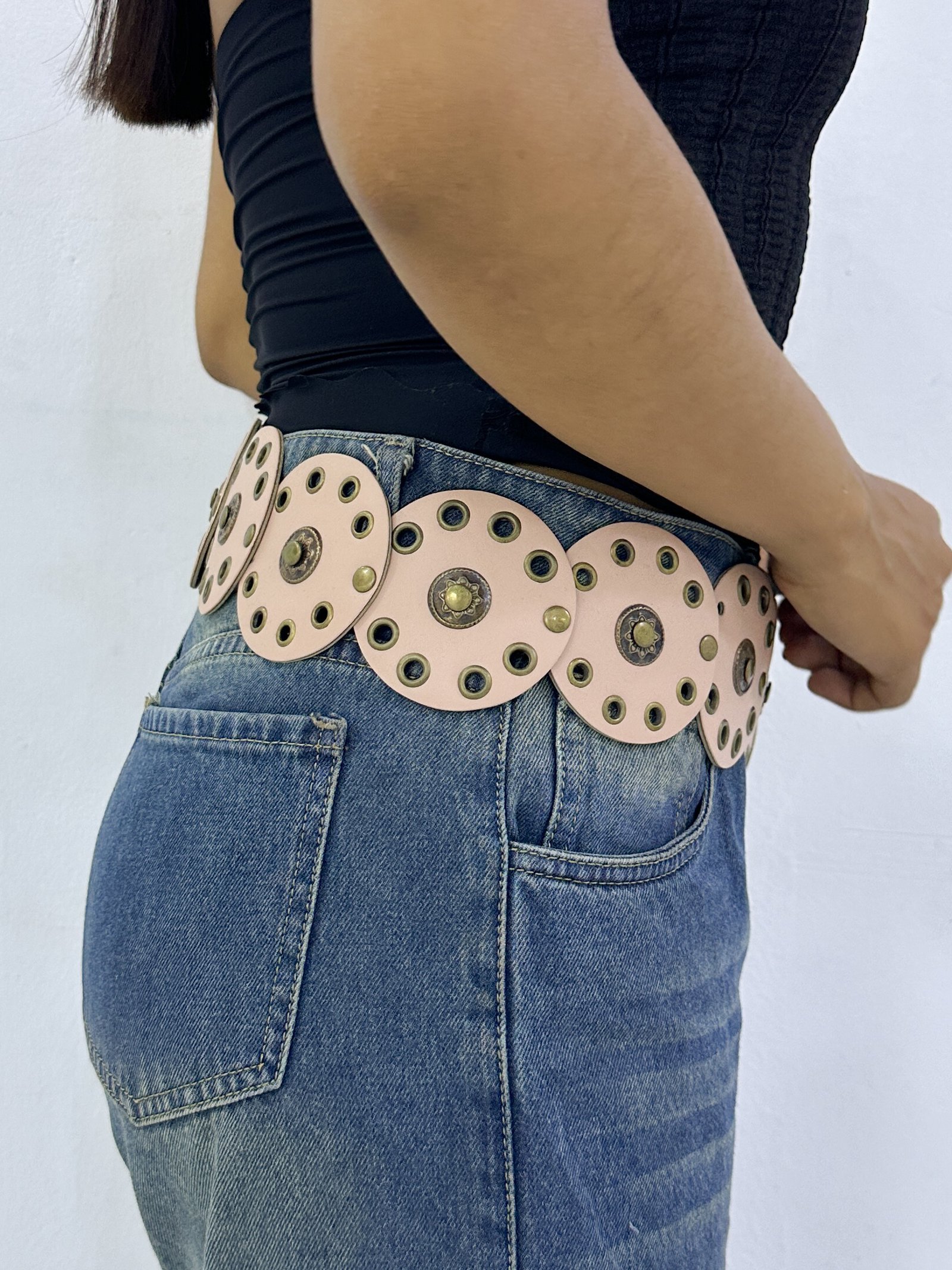 Hebilla metálica circular en tendencia, de circulos en biocuero con detalle de tachas y hebilla en oro viejo.