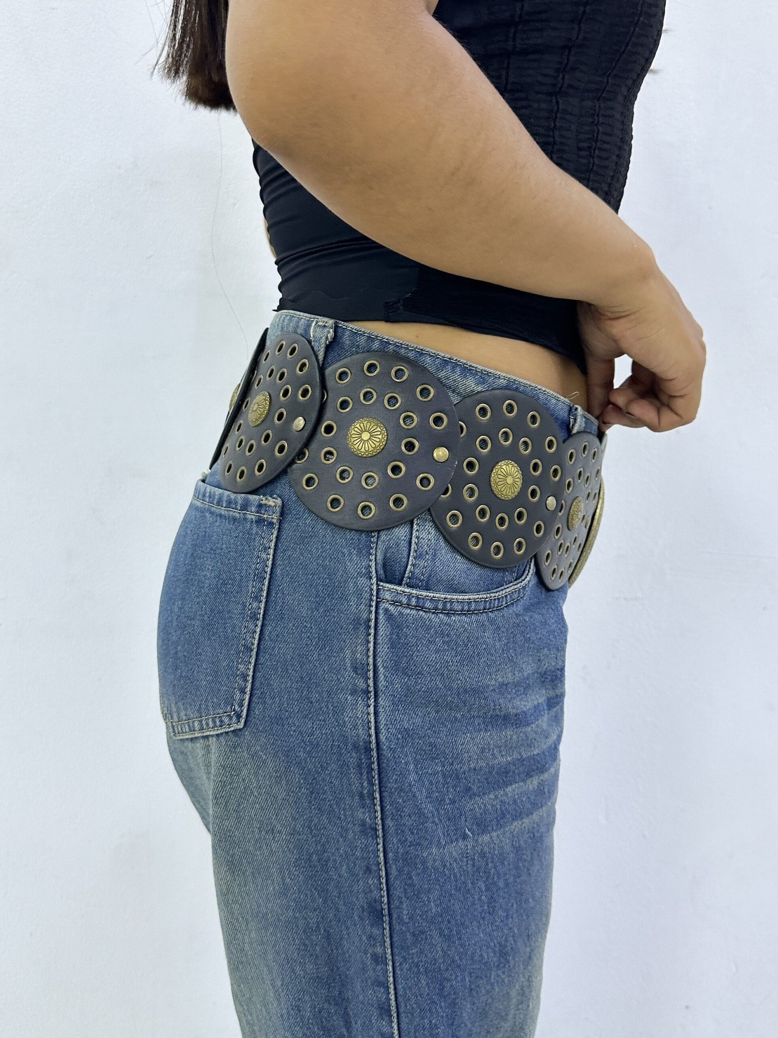 Hebilla metálica circular en tendencia, de circulos en biocuero de 9cm de diámetro, con detalle de tachas y hebilla dorada.