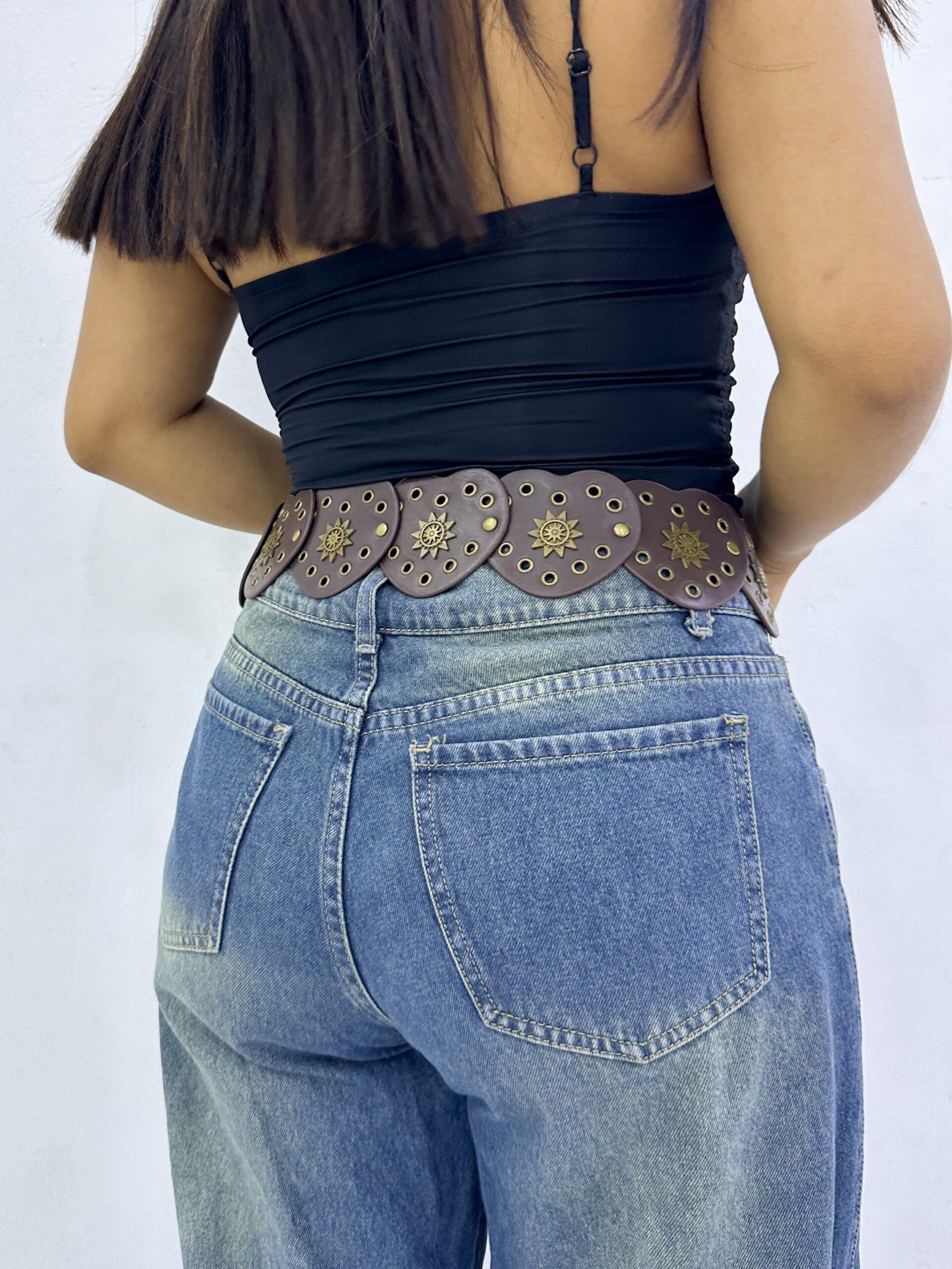 Hebilla con silueta de corazón en tendencia, en biocuero con detalles de estrella y tachas doradas.
