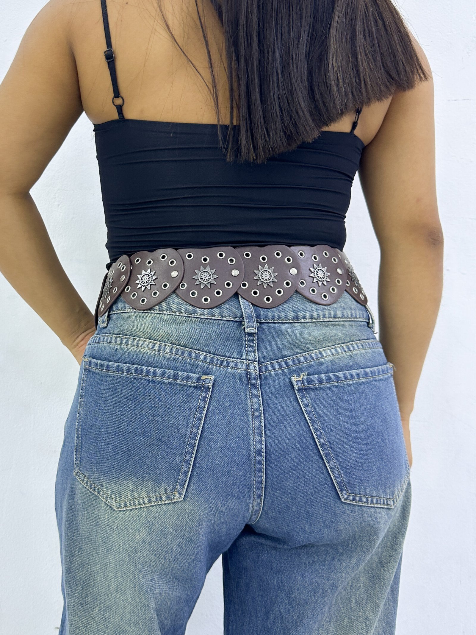 Hebilla con silueta de corazón en tendencia, en biocuero con detalles de estrella y tachas plateadas.