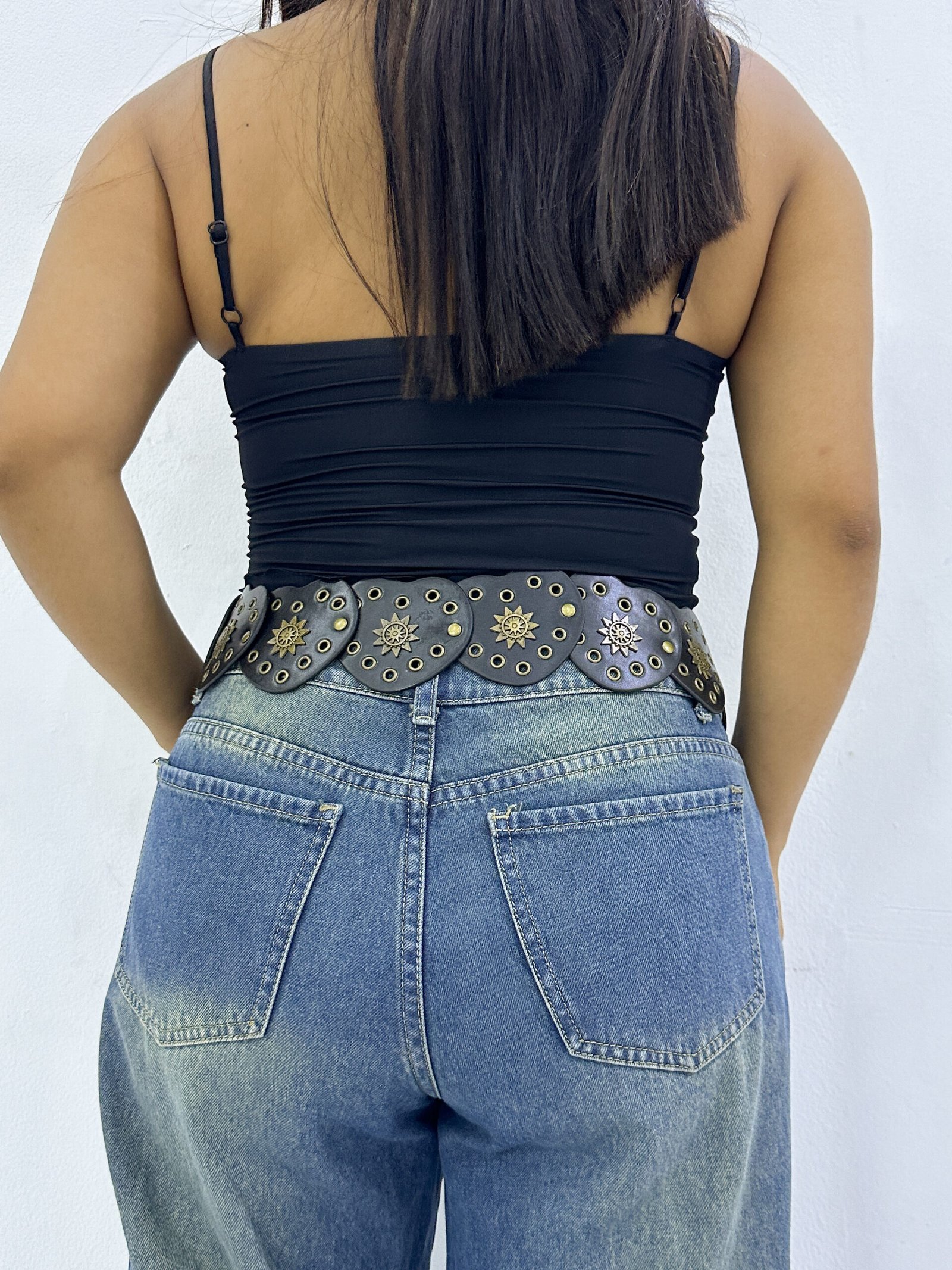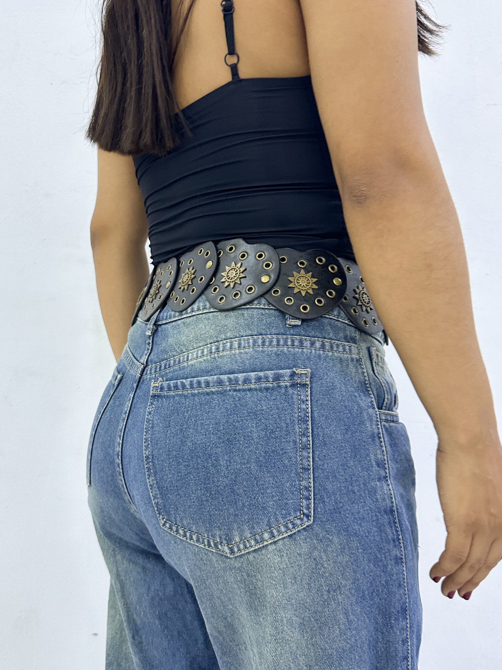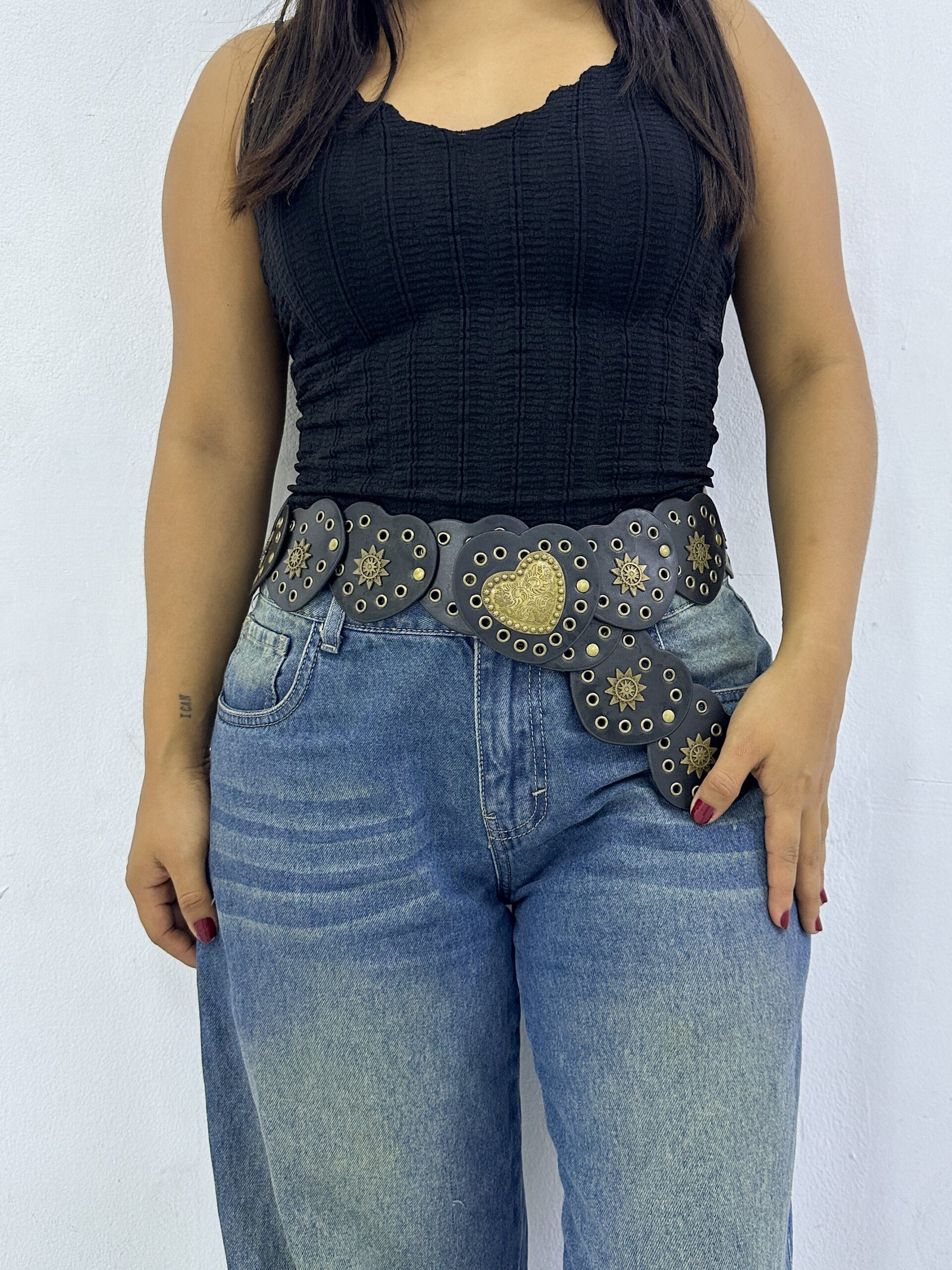 Hebilla con silueta de corazón en tendencia, en biocuero con detalles de estrella y tachas doradas.