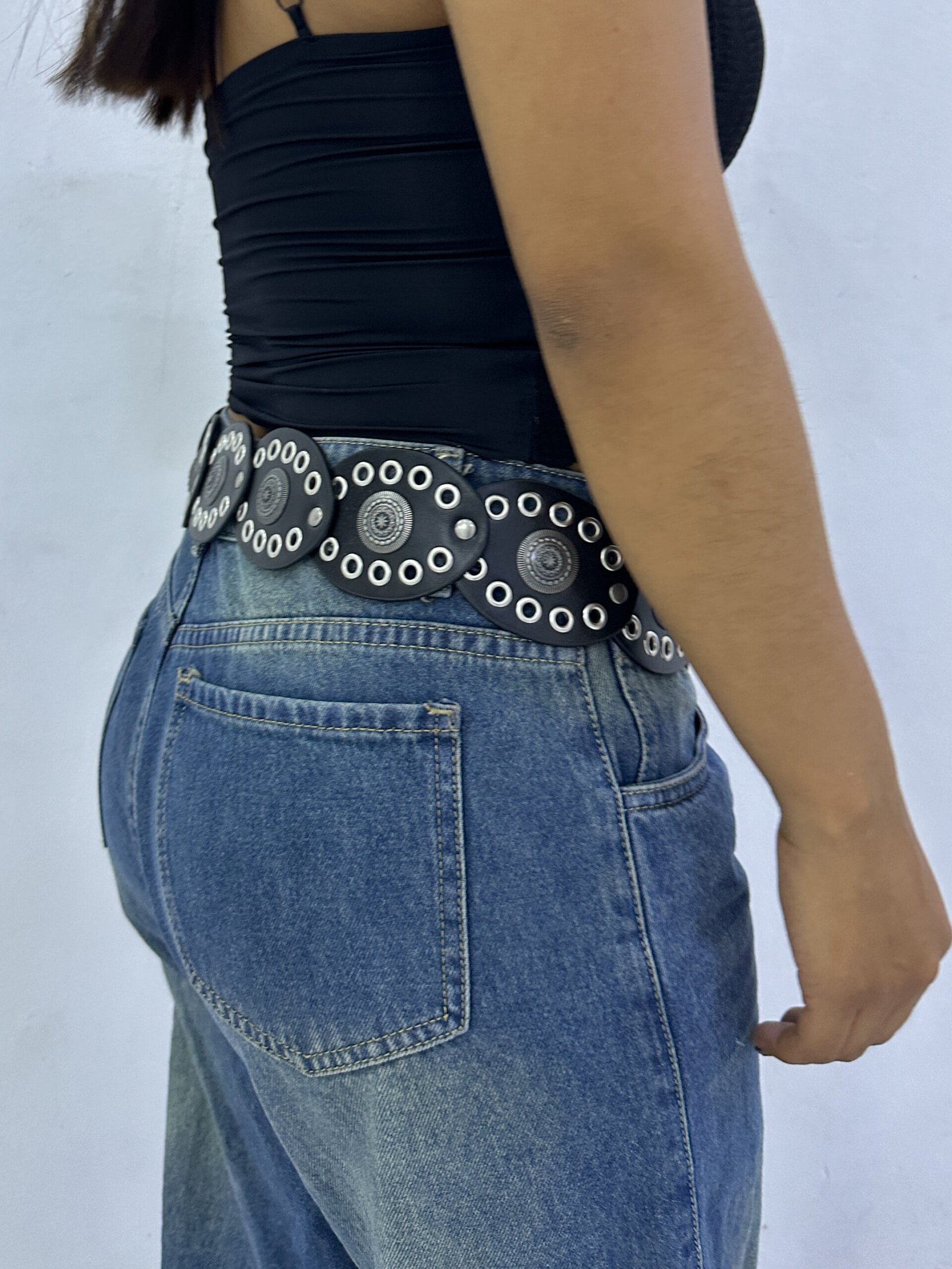 Hebilla metálica ovalada en tendencia, de ovalos en biocuero, con detalle de tachas y hebillas plateadas.