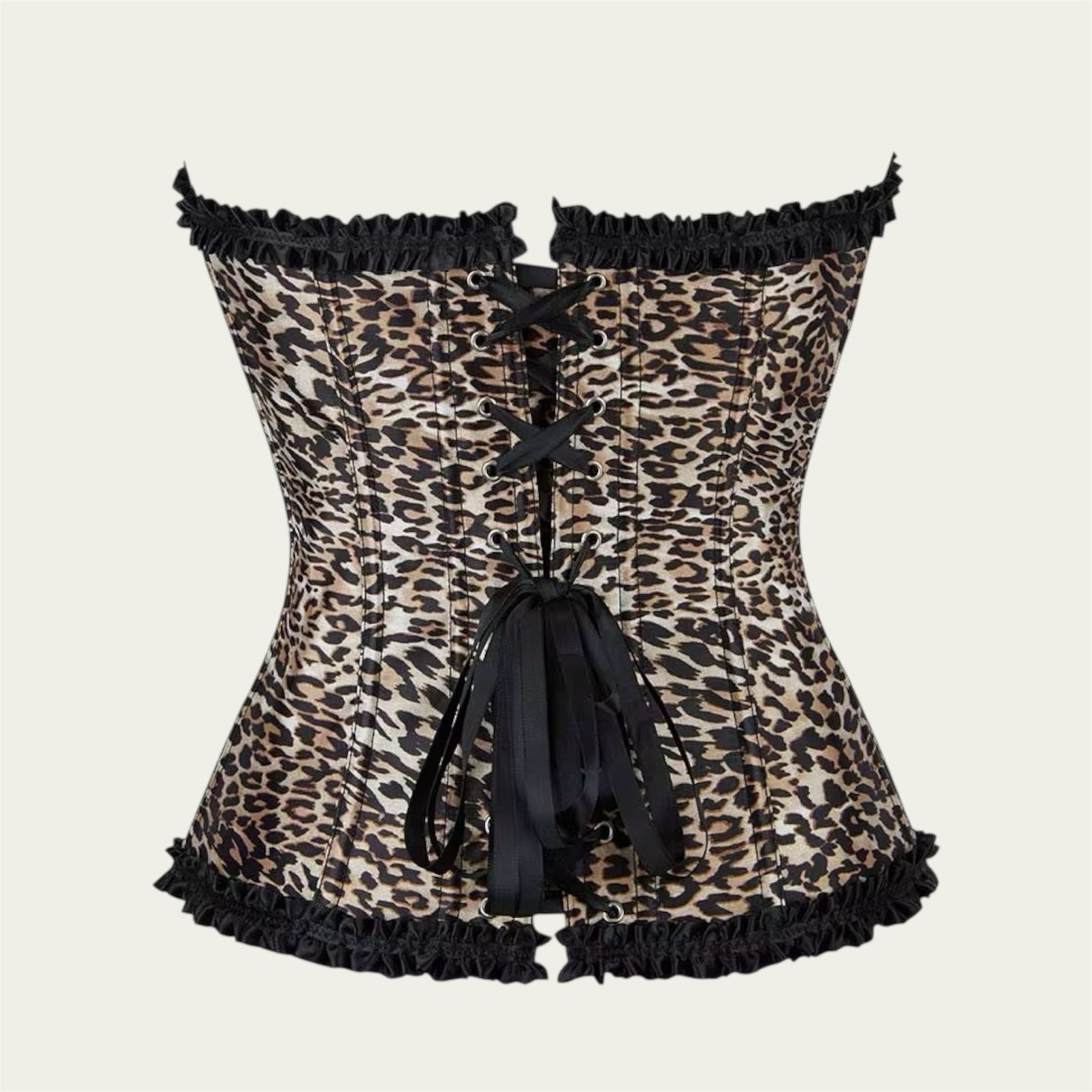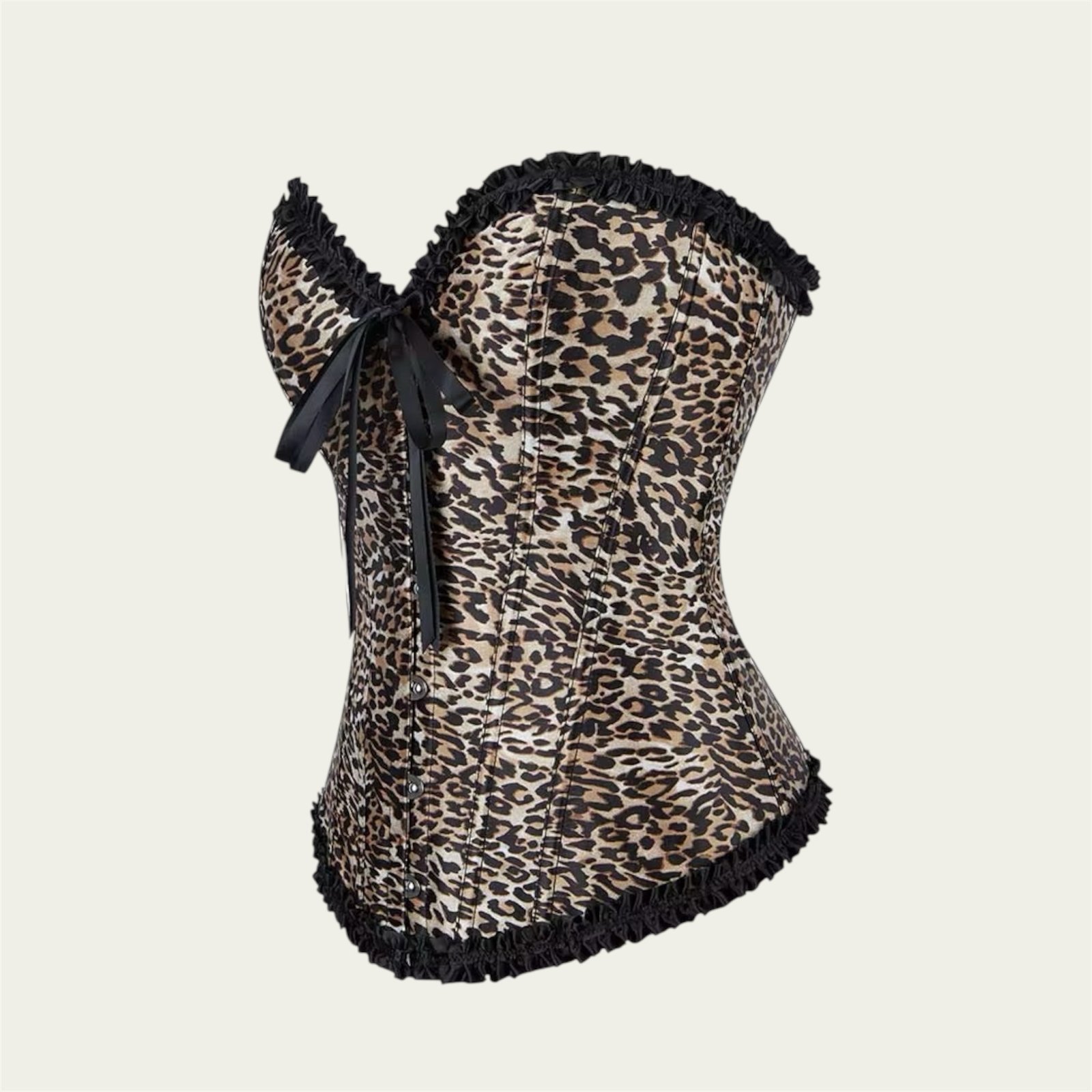 Corset Bustier con diseño Animal print, de corte Victoriano. Presenta broches en la parte delantera, y en la parte posteriorr para ajustar con cinta satinada.