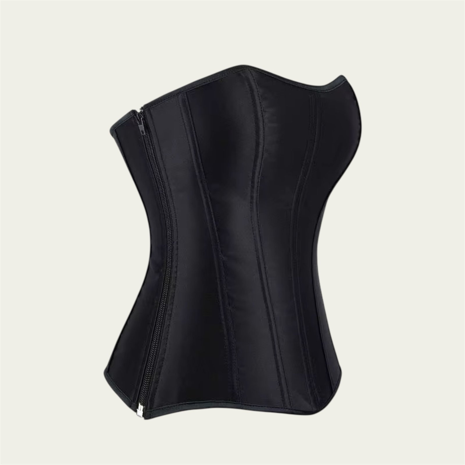 Corset Bustier en material satinado, de corte Victoriano. No presenta broches en la parte delantera, sino un cierre al lado y en la parte posteriorr para ajustar con cinta satinada.