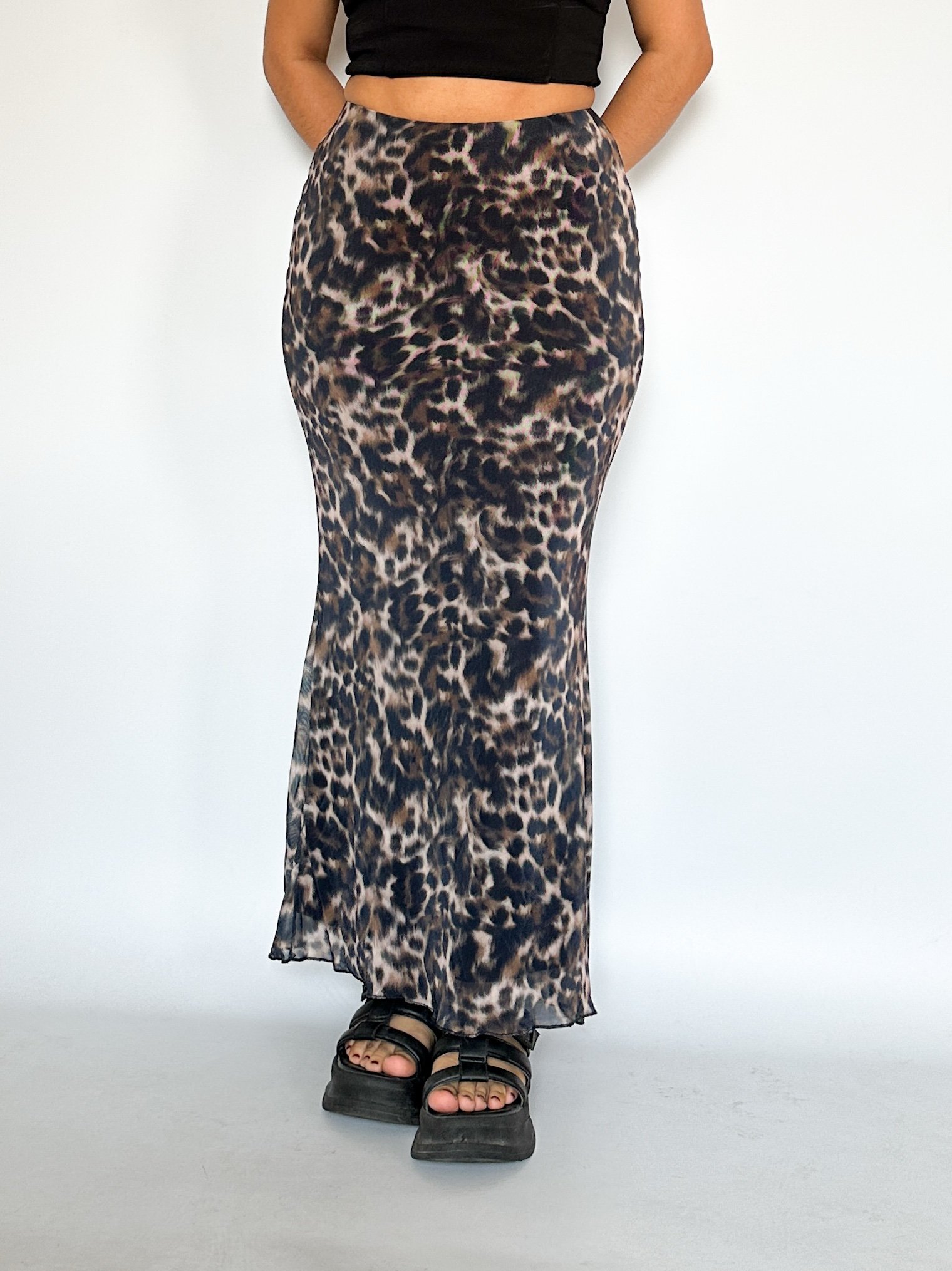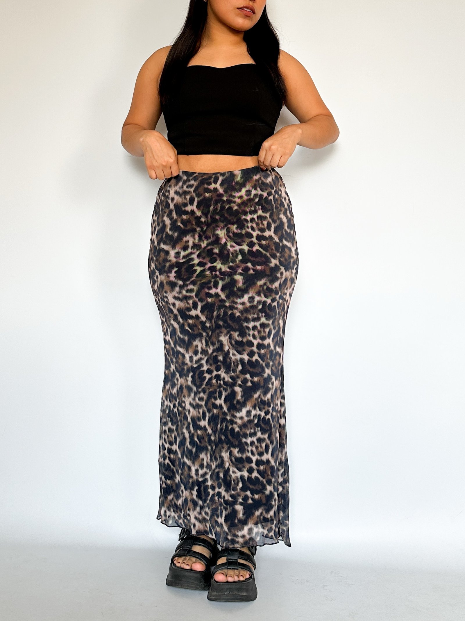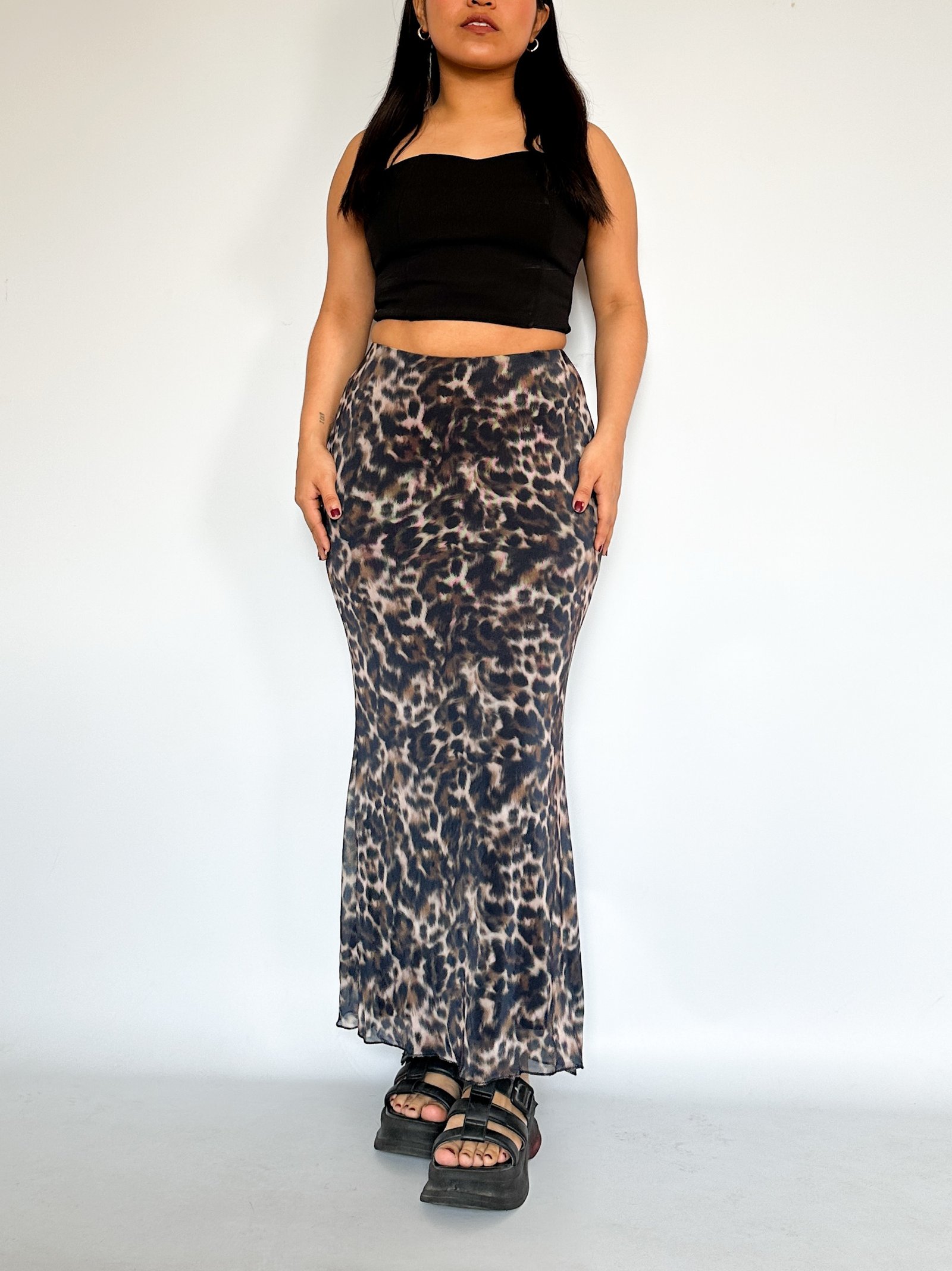 Falda en corte sirena  en Mesh estampado. Tiene una pretina interna y con forro interno largo completo.