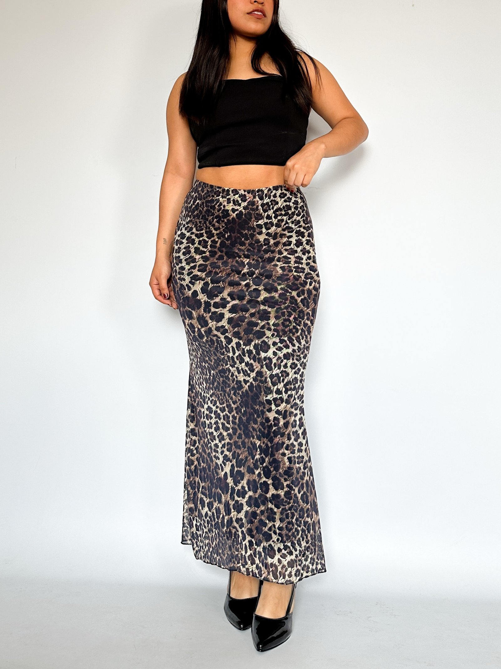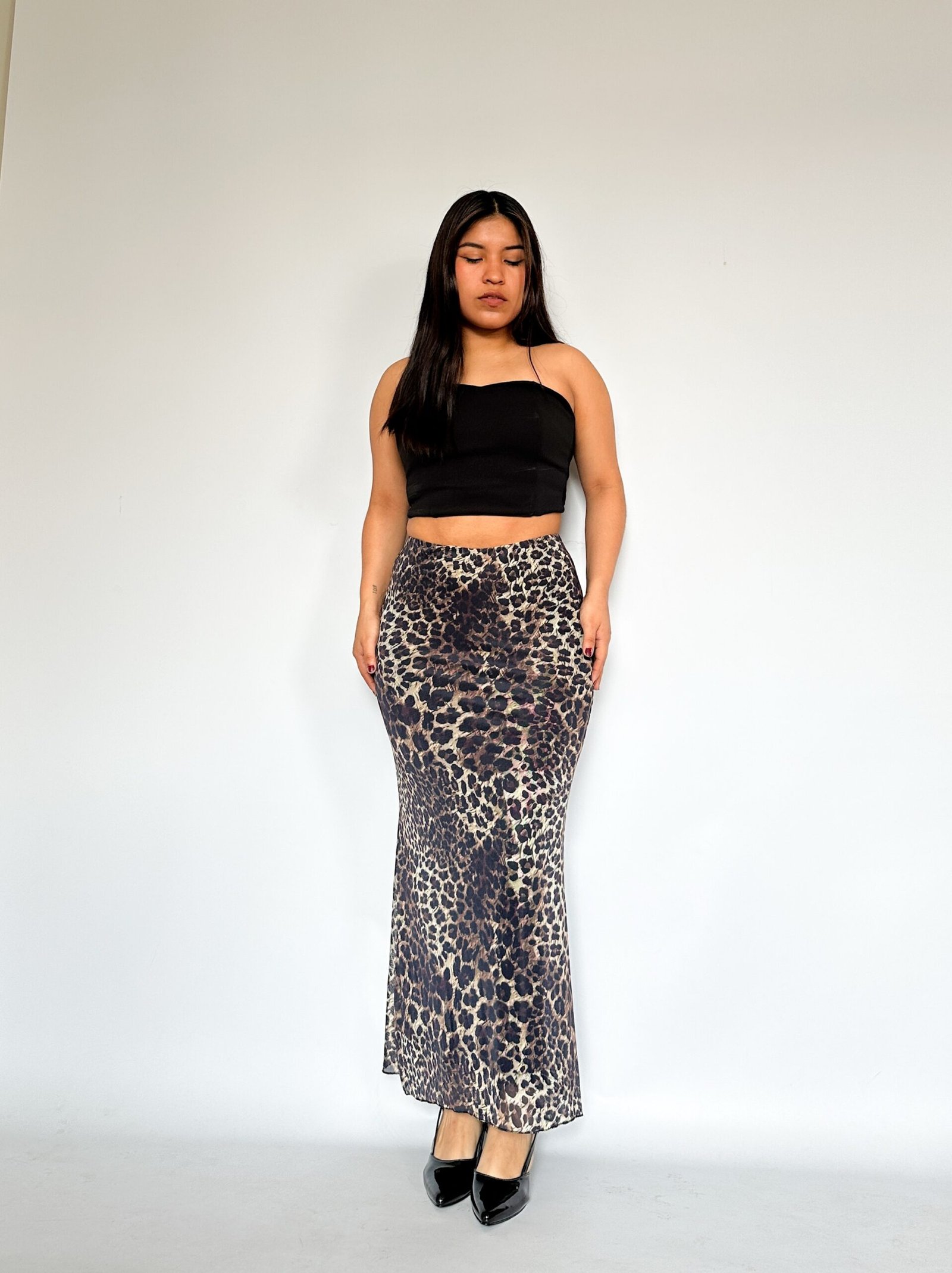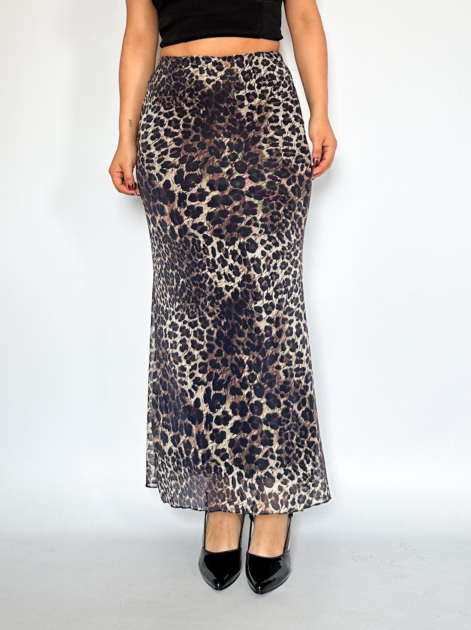 Falda en corte sirena en Mesh estampado. Tiene una pretina interna y con forro interno largo completo.