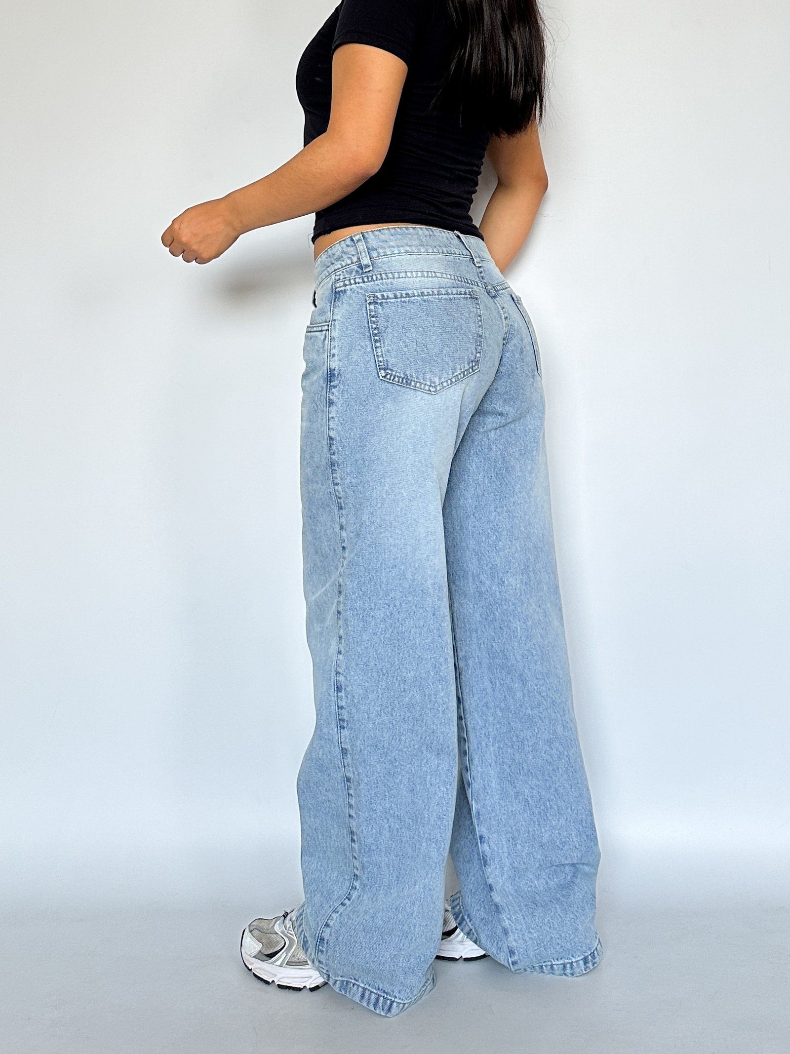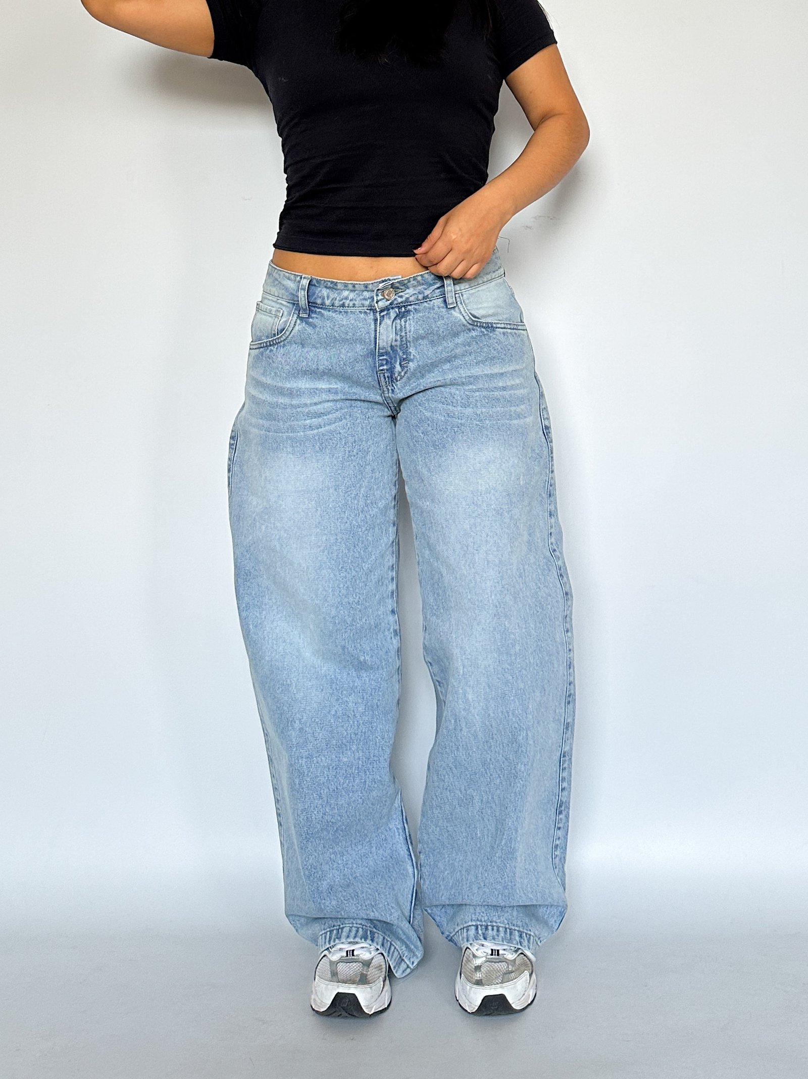 Jeans low rise, el tiro es un tiro bajo en tendencia. De piernas super anchas