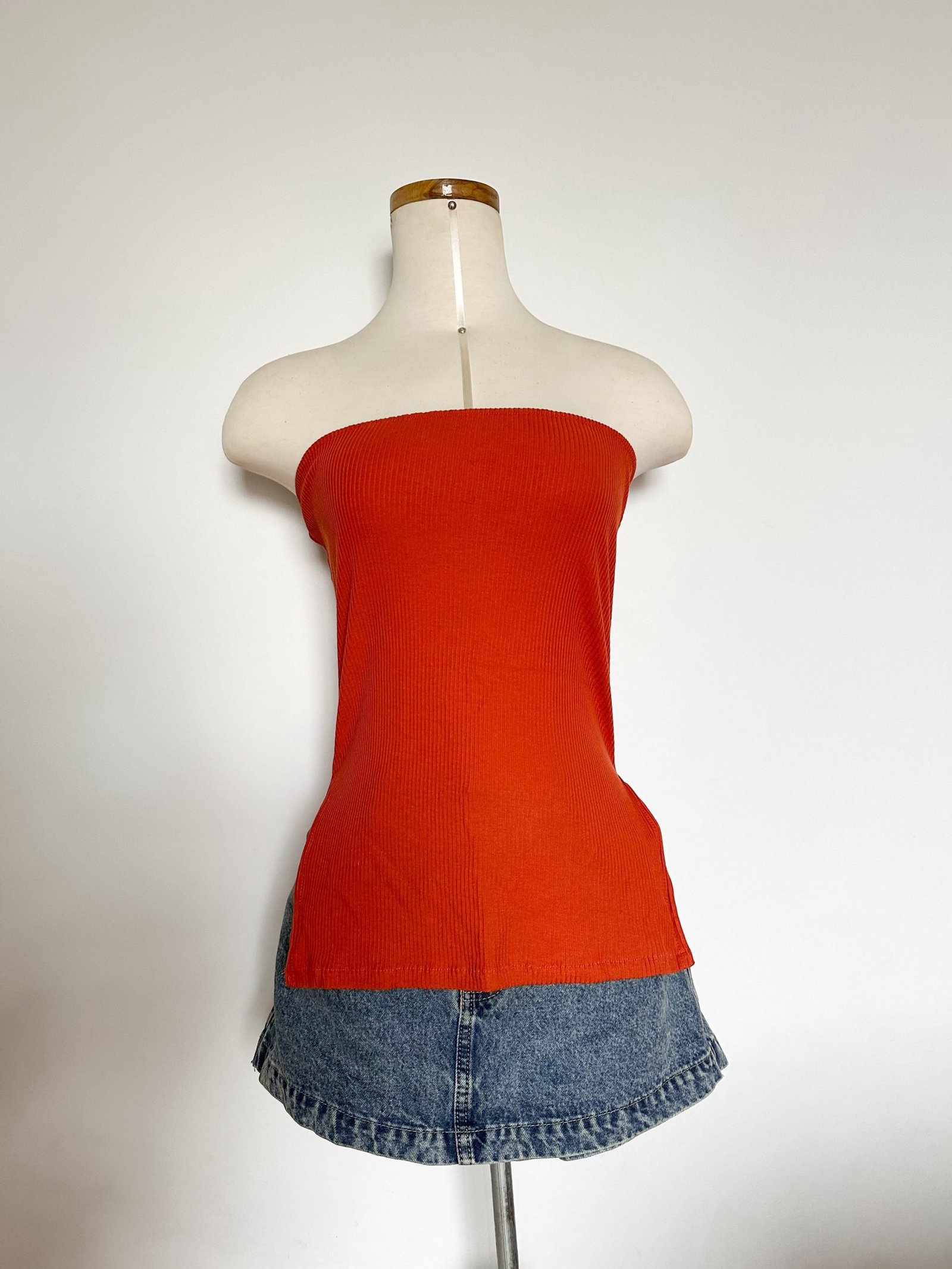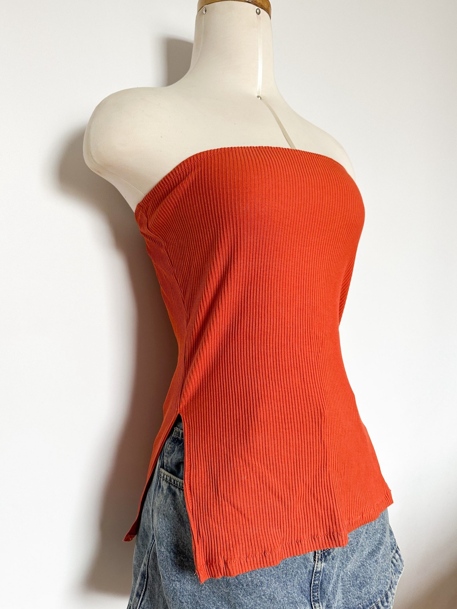 Básico strapless largo, con detalle de corte en ambos lados.